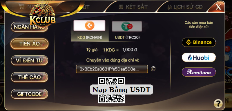 • Bước 1: Chọn mục Nạp bằng USDT trên giao diện tài khoản người chơi