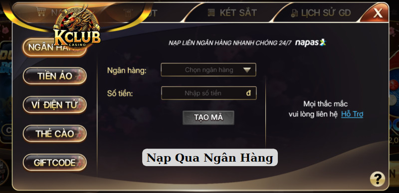 • Bước 1: Đăng nhập vào hệ thống Kclub, chọn Nạp tiền, sau đó chọn Chuyển khoản ngân hàng.